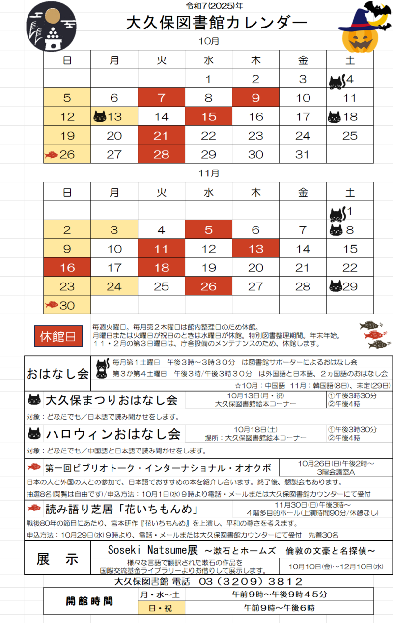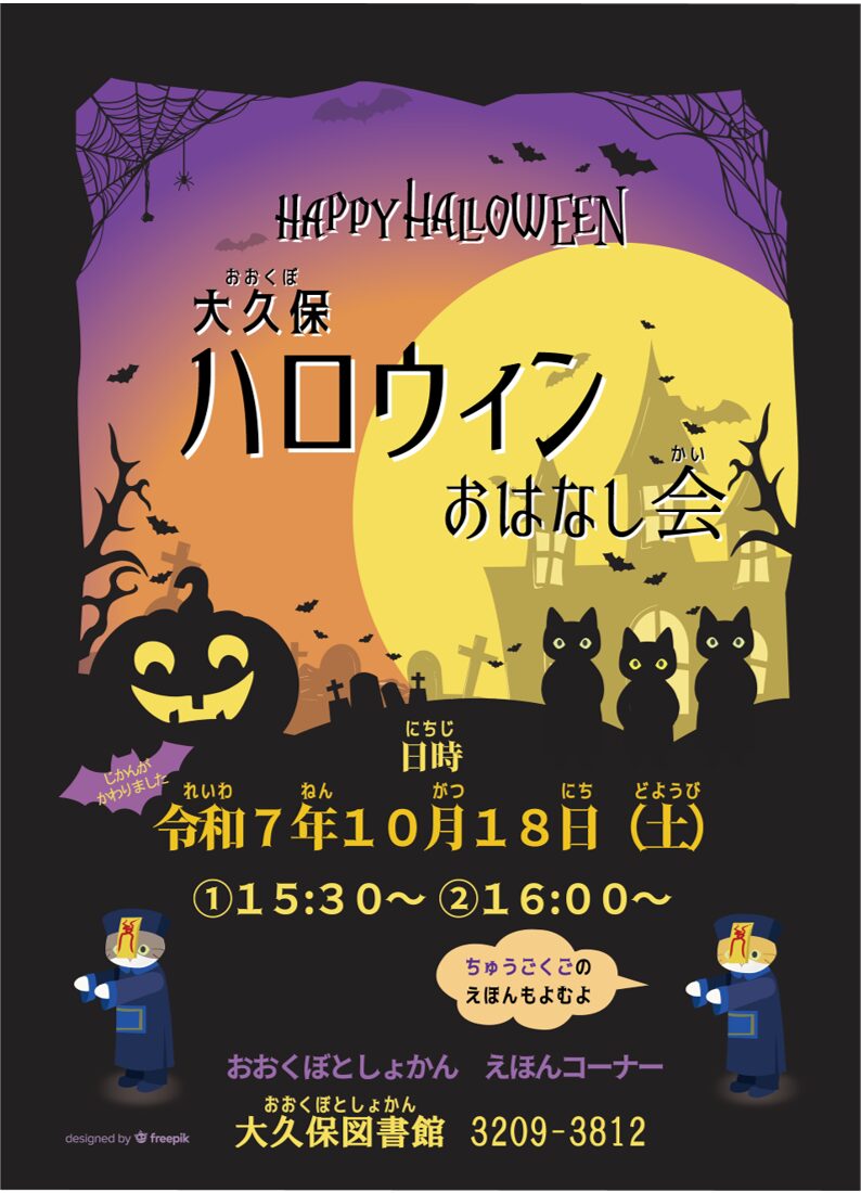 大久保図書館では、ハロウィンにちなんだ特別なおはなし会を開催します。日本語と中国語で楽しい絵本の読み聞かせを行いますので、国際色豊かな大久保ならではの雰囲気をお楽しみください。