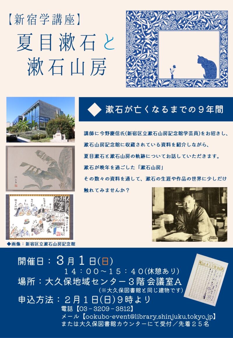 区立漱石山房記念館に所蔵されている資料を紹介しながら、夏目漱石と漱石山房の軌跡についてお話をしていただきます。数々の資料を通して、漱石の生涯や作品の世界に少しだけ触れてみませんか?講師:今野慶信氏(区立漱石山房記念館学芸員)