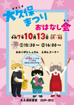 新大久保商店街振興組合主催の第42回大久保まつりに合わせて、大久保図書館にて「おはなし会」を開催します。絵本の読み聞かせを通じて、親子で楽しめるひとときをお過ごし下さい。 日時 令和7年10月13日(月・祝) 第1回:1 […]