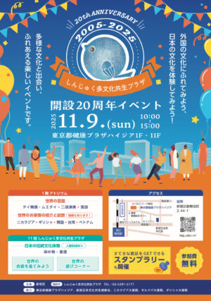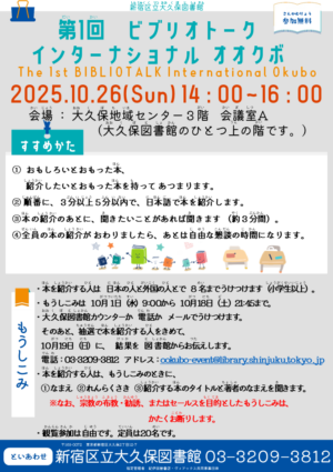 日本の人と外国の人が一緒に、おすすめの本を紹介し合う交流イベントです。本の紹介を通じて、国や言葉を超えたつながりを楽しみましょう。 開催概要 日時:令和7年10月26日(日)午後2時〜4時 会場:大久保地域センター3階 […]